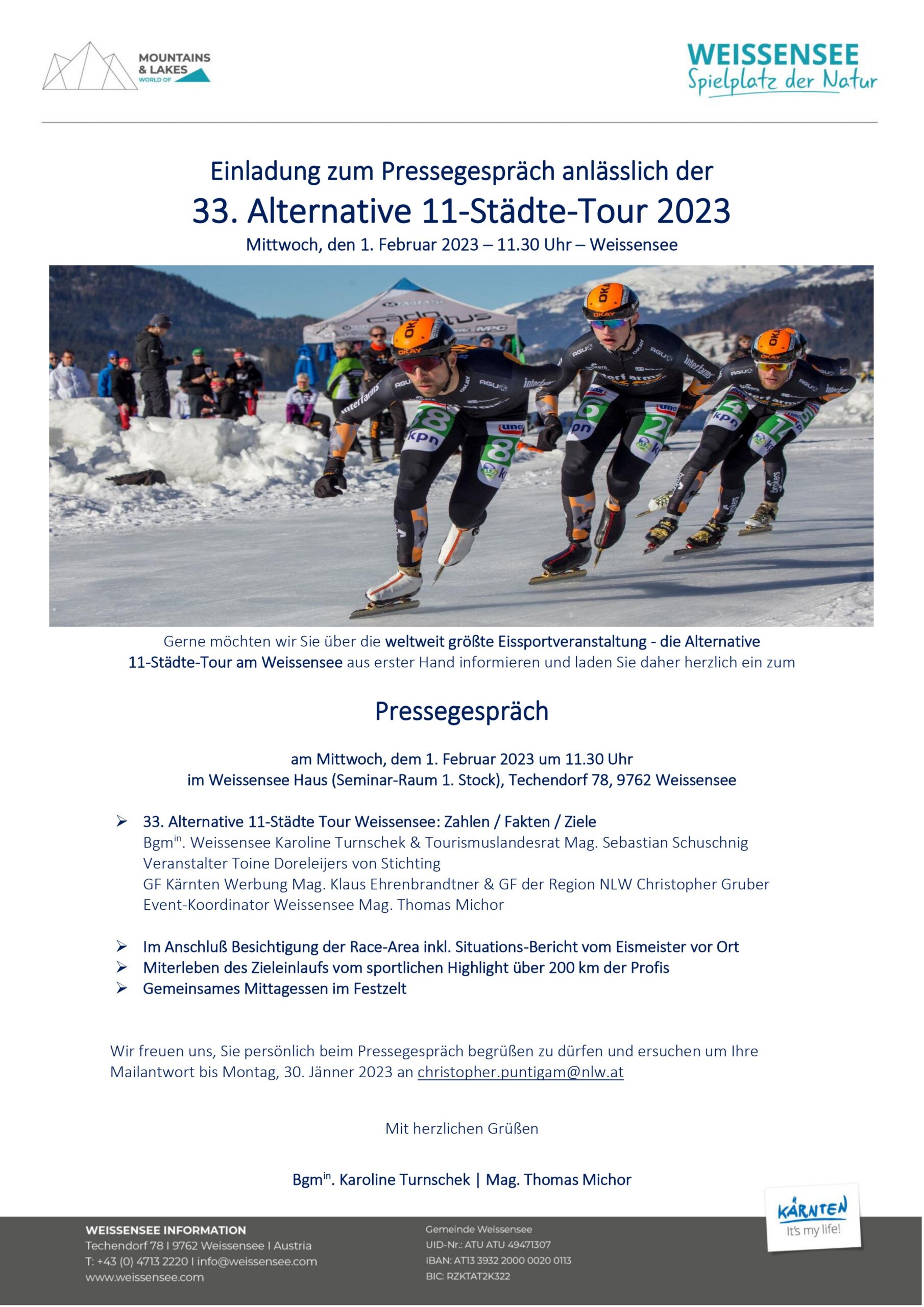 Gerne möchten wir Sie über die weltweit größte Eissportveranstaltung – die Alternative 11-Städte-Tour am Weissensee aus erster Hand informieren und laden Sie daher herzlich ein zum Pressegespräch am Mittwoch, dem 1. Februar 2023 um 11.30 Uhr im Weissensee Haus (Seminar-Raum 1. Stock), Techendorf 78, 9762 Weissensee