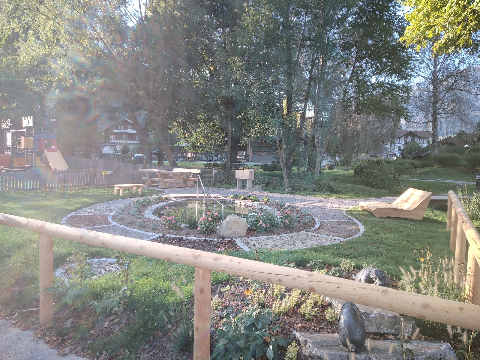 Die Kneippanlage besteht aus einem Wassertretbecken und einem direkt danebenliegenden Becken zum Eintauchen der Arme. Damit auch Kinder die gesunde und erfrischende Möglichkeit des Kneippens nutzen können, wurde hinter das Armbecken ein Stein als Aufstieg platziert.