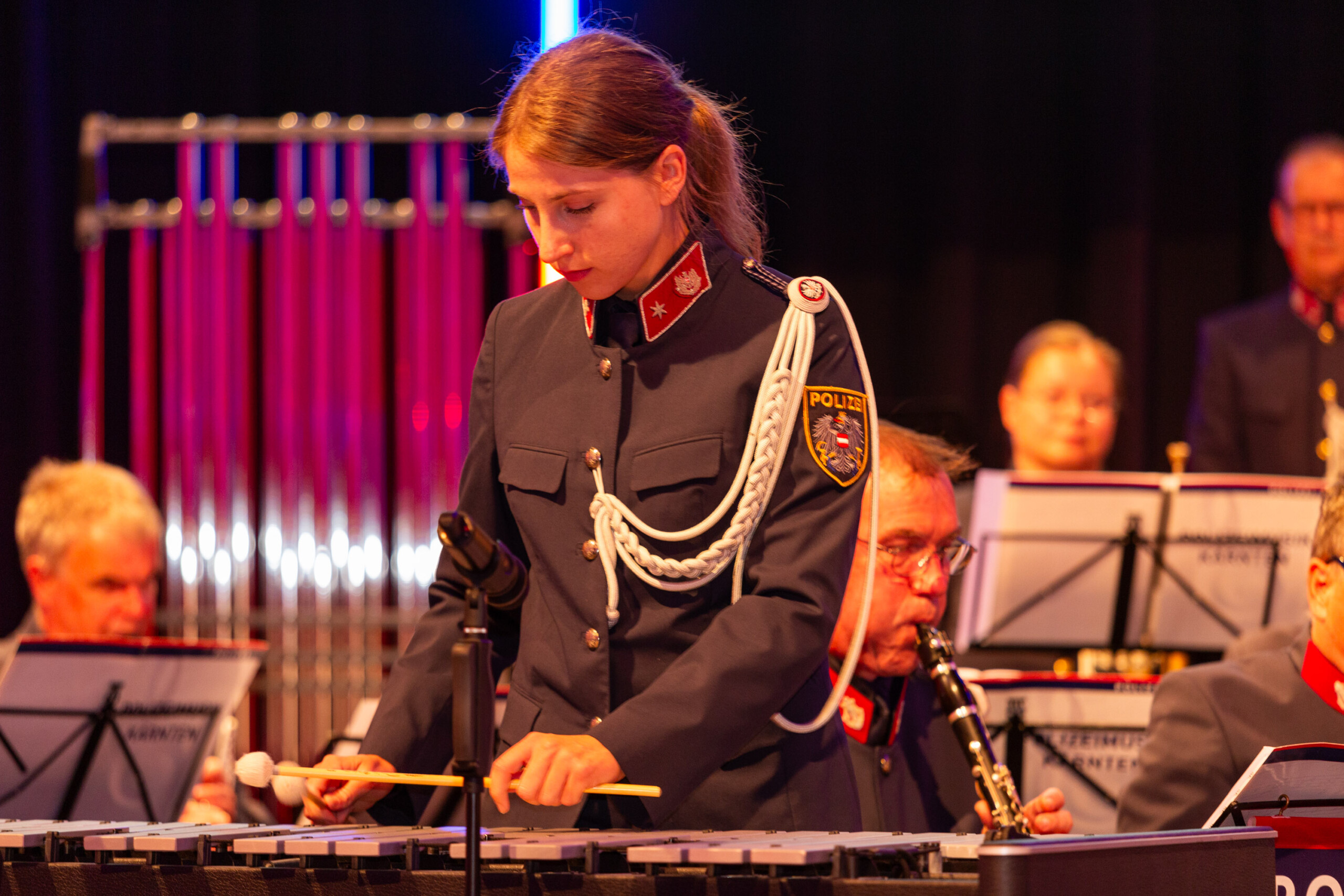 Ein besonderer musikalischer Leckerbissen wurde mit „A Tribute To Lionel“ geboten, ein Solostück für Vibraphon. Der Polizeichor zeigte sich ebenso international und war mit „De Liesertål-Liadlan“ und „Aloha Oe“ von Kärnten bis nach Hawaii unterwegs.