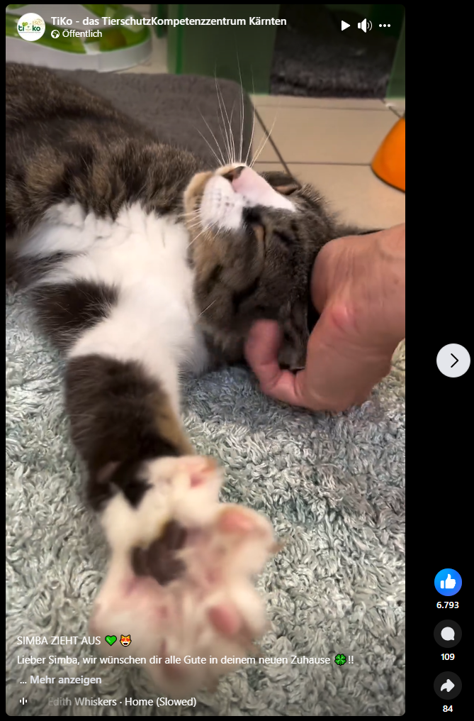 Berührende Bilder von Simbas Adoption wurden als Video-Reel auf allen gängigen Social Media Plattformen hochgeladen. Knapp eine Woche nach seinem Auszug aus dem Tierheim kam die Überraschung für die TiKo Mitarbeiter: Das Video ging auf Facebook viral und wurde bereits mehr als 250.000-mal angesehen. Mit mehr als 6.500 Likes sticht es deutlich aus der üblichen Reichweite der Tierheim-Postings heraus.